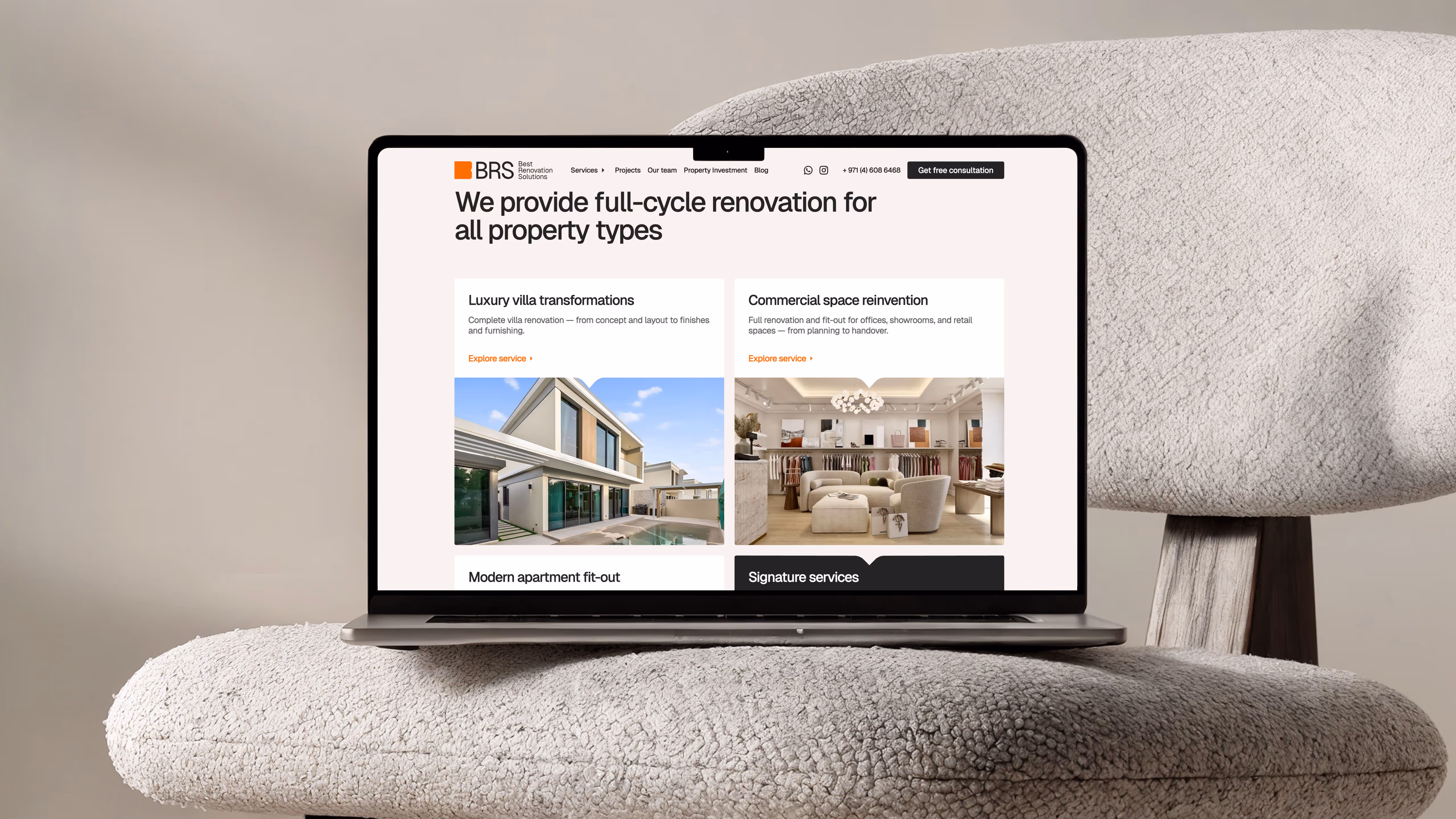 BRS offers full-service renovation with clear solutions for clients. We created a web concept and compact visual identity built around the idea of simplicity. The updated logo and visuals became the foundation for a minimalist Webflow website on Webflow CMS with multiple collections, so the client can manage all content on their own.