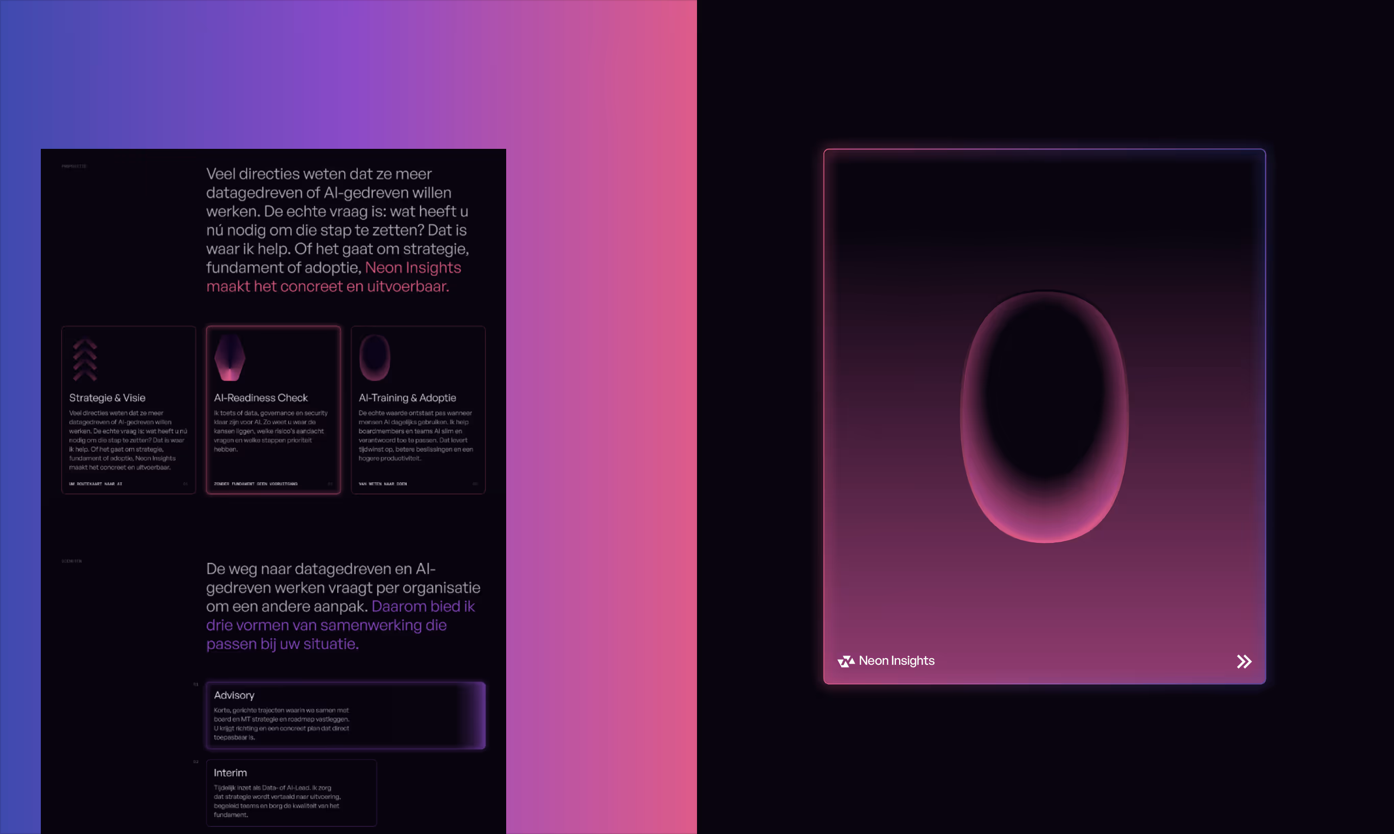 Neon Insights is a Netherlands-based consulting company focused on data analytics and AI. We developed a compact visual identity from scratch. The idea was to create a clean style with neon elements that show the company uses modern tools and offers clear, simple solutions.