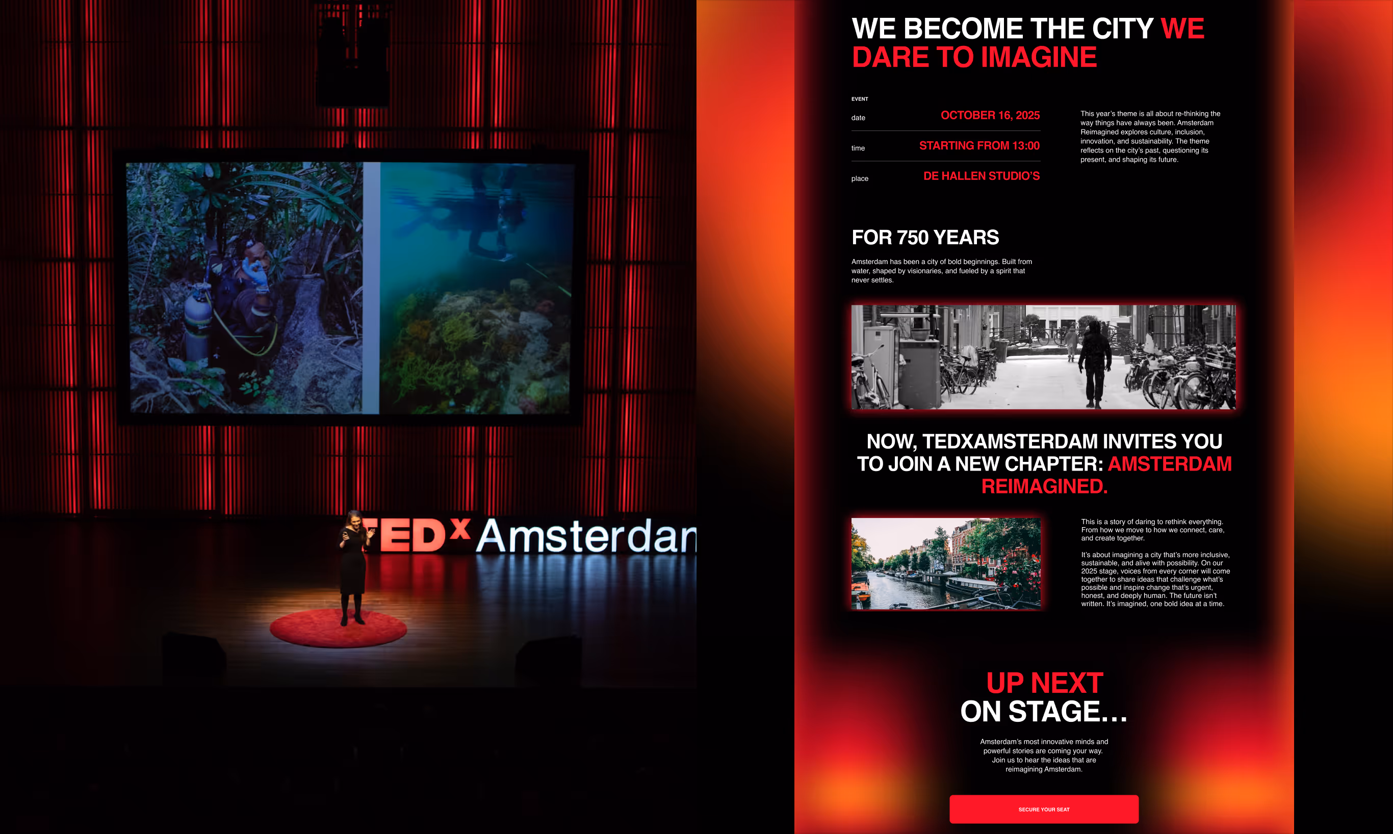 We partnered with TEDxAmsterdam to design and build a website for their “Amsterdam Reimagined” event. “Amsterdam Reimagined” explores culture, inclusion, innovation, and sustainability.